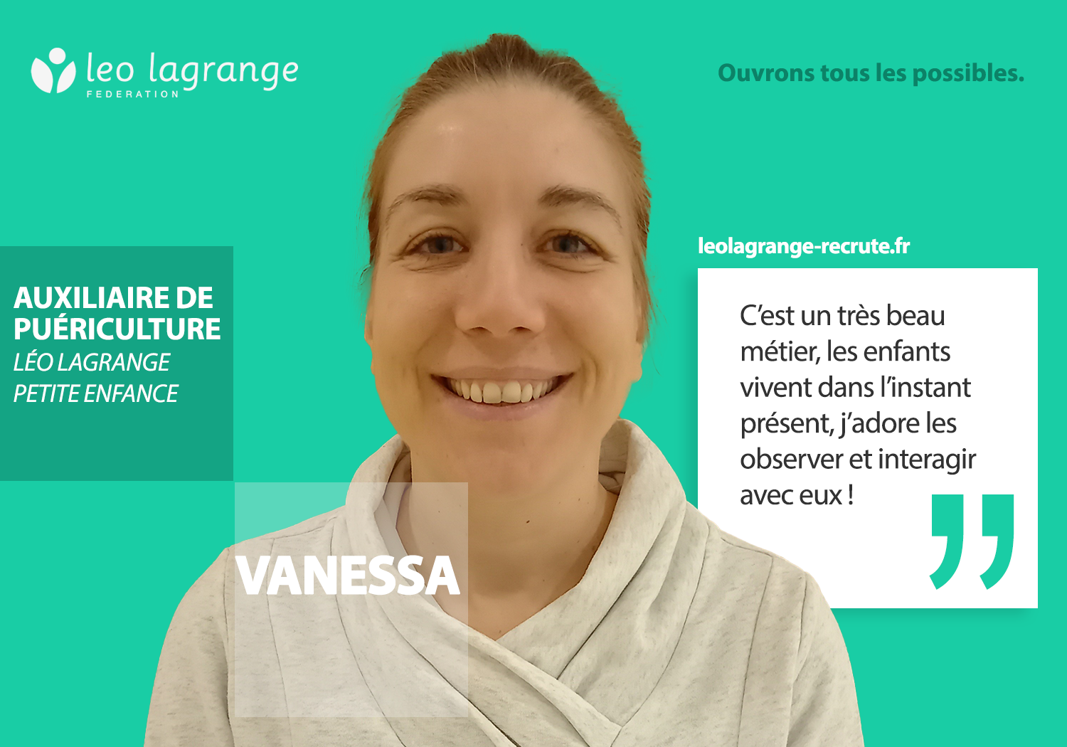 Les auxiliaires de puériculture accompagnent les jeunes enfants, répondent à leurs besoins quotidiens, qu’il s’agisse des repas, des changes mais aussi contribuent à leur éveil et à leur épanouissement, en leur proposant des activités en adéquation avec leur âge et leur stade de développement. En crèche, il·elles participent à l’accompagnement à la parentalité également et collaborent avec des aides-auxiliaires, éducateur·rices de jeunes enfants, infirmier·ères et psychomotricien·ne. Vanessa, professionnelle Léo Lagrange petite enfance depuis 2011, répond à quelques questions sur son métier.